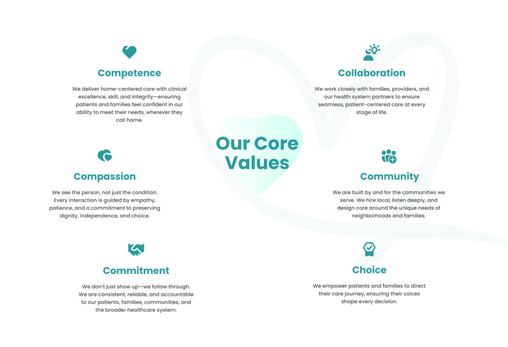 To build a community-rooted care network that delivers the full spectrum of in-home services—from skilled nursing and rehabilitation to daily living support—so that every individual can age, heal, and thrive at home with dignity, independence, and choice.